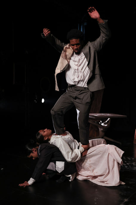 Letter 8 to Moûsai is inspired by the writings of Franz Kafka, particularly the letter Dearest Father. Wanting to capture the harsh family dynamic in the Kafka home, the set for Letter 8 was inspired by German Expressionist films such as The Cabinet of Dr Caligari. The intention was to explore how Franz viewed his home as distorted, harsh and seemingly fleeting. The costume elements were inspired by the real life occupation of Herman, Franz’s father, who was the owner of a tailoring business in Prague. There was exploration of the construction and deconstruction of garments in the process of tailoring and garment making.
